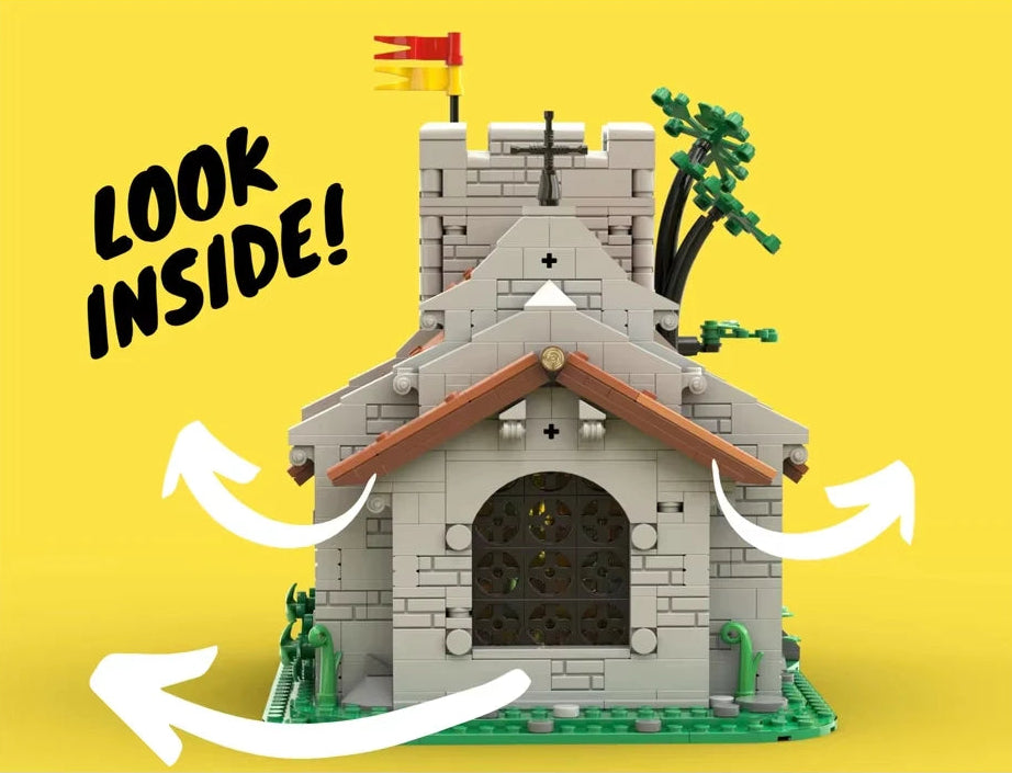 Intricate details like creeping vines, arched windows, and a heraldic flag bring the scene to life, evoking the atmosphere of medieval markets, festivals, and solemn gatherings. Whether as a display piece or part of a larger castle layout, it’s a build that tells centuries of stories in brick form.